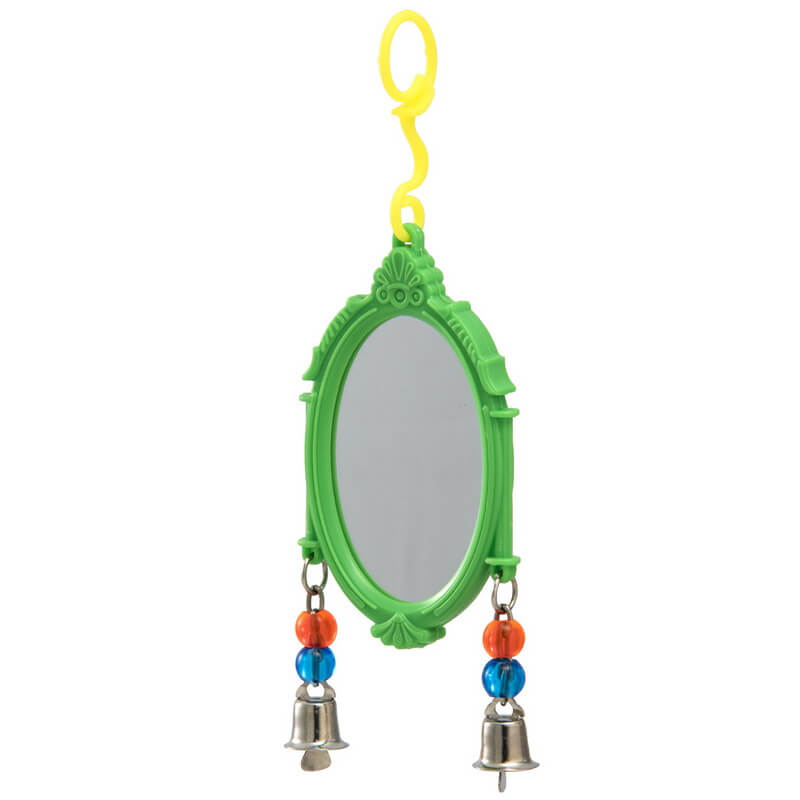 飾り枠のついた鏡にビーズとベルの付いた楽しいおもちゃ。