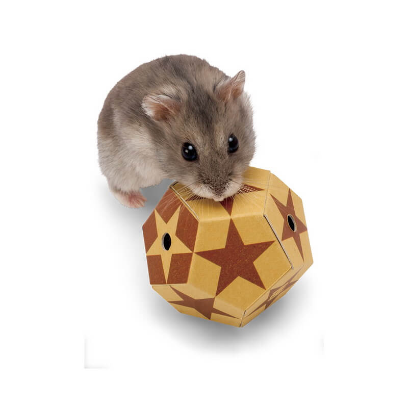 ハムスターが野生本来の採食行動を発現できるよう工夫した正12面体のおもちゃ、12面体の中におやつを入れて与えてください。