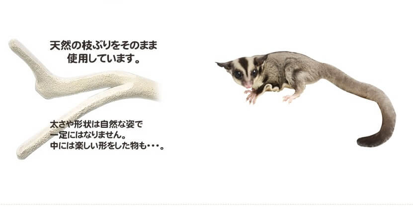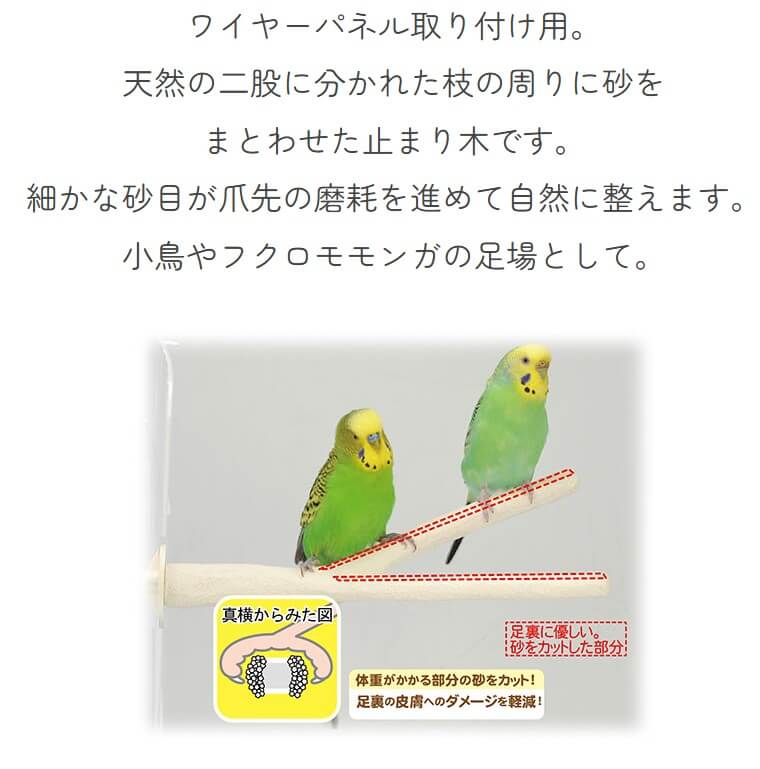 ワイヤーパネル取り付け用 天然の二股に分かれた枝の周りに砂をまとわせた止まり木です。細かな砂目が爪先の磨耗を進めて自然に整えます。